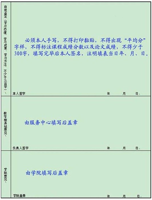 二、請提前撰寫好字數(shù)不少于300字的的“個人鑒定”,根據(jù)在學院學習期間的態(tài)度、成果、方法等方面來總結(jié)。個人鑒定必須手寫,不能粘貼打印稿;