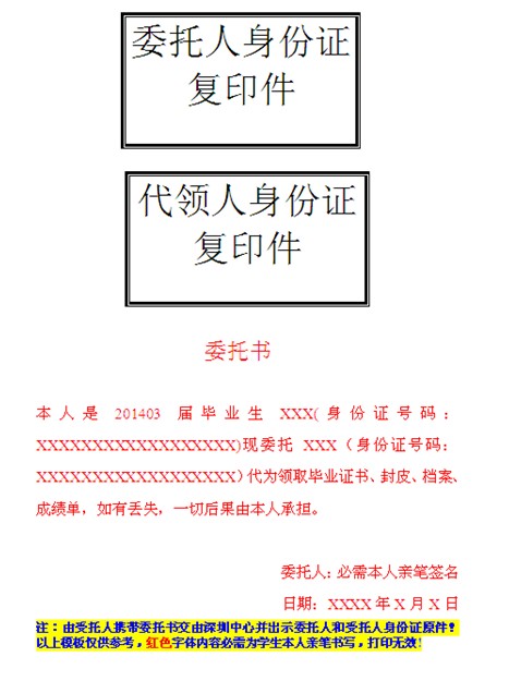 如需委托他人代領(lǐng),必須出示本人及代領(lǐng)人身份證原件,以及由本人親筆書寫的委托書。(委托書內(nèi)容包含:本人及代領(lǐng)人身份證復(fù)印件、在復(fù)印件空白處由本人親筆書寫的委托內(nèi)容。)屆時(shí)由深圳中心留存。特別提示:檔案已密封,請(qǐng)同學(xué)們妥善保管切勿私自拆封!