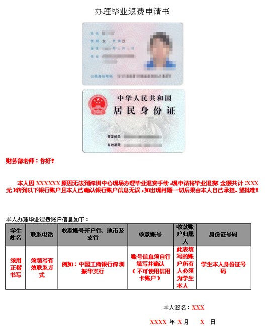 5、代領(lǐng)需由代領(lǐng)人簽名、簽領(lǐng)取年、月、日,同時(shí)填寫“畢業(yè)退費(fèi)申請(qǐng)書”交給財(cái)務(wù)辦理銀行轉(zhuǎn)賬。