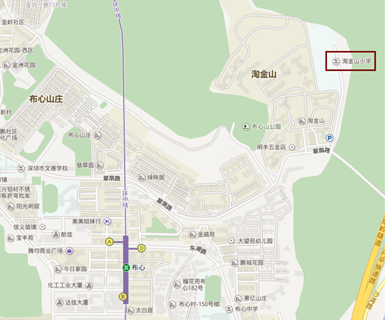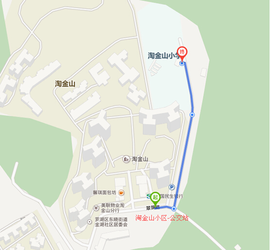 公交站:淘金山小區(qū)站,下車后車流順方向直走左拐300米左右即可到達(dá)(詳見下圖)。