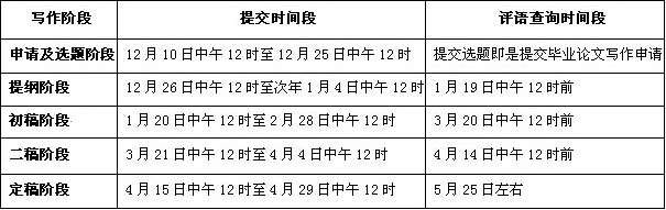 為配合學院教學環(huán)節(jié)和學習周期優(yōu)化的工作,學院已開始變更執(zhí)行新的本科畢業(yè)論文寫作周期,201412批次論文寫作安排時間表如下:(具體情況請參見《本科畢業(yè)論文寫作管理辦法》)
