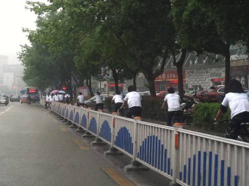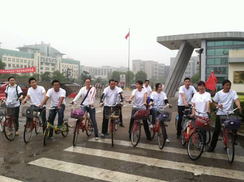 活動受到了網(wǎng)上人大學(xué)員的積極響應(yīng),以201103和201109屆學(xué)員為主,紛紛報名參加,自行準(zhǔn)備20多輛車組成騎行隊,按時到達(dá)集合地點(diǎn),領(lǐng)取行動必需品,宣讀注意事項后出發(fā)。騎行學(xué)員隊長前面領(lǐng)隊,懸掛“中國人民大學(xué)網(wǎng)絡(luò)教育學(xué)院低碳行自行車騎行活動”旗幟,按編號單列行駛,隊尾為活動用車和應(yīng)急工作人員。所有隊員都遵守組織紀(jì)律、服從統(tǒng)一安排,跟隨小紅旗指揮,隊列整齊,勻速騎行。一路上,我們整齊劃一穿著帶標(biāo)志白色體恤的車隊吸引了不少路人的目光,這無疑也加大了我們的宣傳力度。雖然途中下了小雨,大家仍冒雨前行,不怕苦不怕累,精神可嘉。其中有幾個學(xué)員表現(xiàn)尤為突出:例如網(wǎng)上人大201109屆學(xué)員林益宇等5人一大早從臺州工貿(mào)重鎮(zhèn)——澤國騎車出發(fā)到椒江區(qū);蒲壯8點(diǎn)鐘就冒著雷陣雨從路橋區(qū)趕來;李彩燕的女兒騎著小自行車一路緊緊跟隨著隊伍。