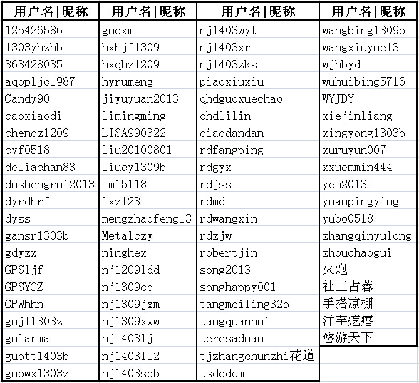 為了鼓勵(lì)參與活動(dòng)在線——2014年公益活動(dòng)日專版活動(dòng)的學(xué)生,我們抽取了以下用戶名\昵稱進(jìn)行獎(jiǎng)勵(lì),請(qǐng)獲獎(jiǎng)?wù)咴?span style="color: #ff0000">7月14日以前進(jìn)行身份認(rèn)證,以參與認(rèn)證的實(shí)際人數(shù)發(fā)放獎(jiǎng)品。