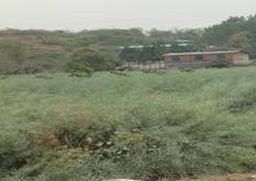 學(xué)校大門和正對(duì)校門口果實(shí)累累的油菜地