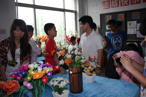 我們先參觀了孩子們的作品,有書法、泥雕、彩繪、絹花制作等??吹竭@些作品,大家心里不免有些震撼。孩子們在這里除了學(xué)習(xí)文化課,還能學(xué)習(xí)一些生活技能。隨后,我們走進(jìn)孩子們的課堂和他們面對面地進(jìn)行了交流。老師告訴我們,學(xué)校里有幾個孩子經(jīng)過訓(xùn)練可以和我們進(jìn)行簡單的語言交流。剛開始孩子們的眼神中還流露出了幾分陌生,在老師的引導(dǎo)下,我們很快和孩子們打成了一片,大家玩的都很開心。孩子們教我們手語,我們就盡可能地通過大聲的講話或者用紙筆來表達(dá)我們的意思。