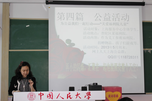 此次活動得到了同學(xué)們的廣泛關(guān)注,為此我們還成立了“網(wǎng)上人大上海公益群”,希望將公益活動常態(tài)化。在201303屆畢業(yè)生畢業(yè)之際,本屆畢業(yè)生響應(yīng)學(xué)院公益號召,主動為福利院兒童捐款、捐書、捐物等,積極參與了此次活動,有很多同學(xué)甚至沒有留下自己的名字。在這里,我們代表福利院的兒童感謝同學(xué)們獻出的一份份愛心。由于上海禽流感的爆發(fā),目前暫時無法將同學(xué)們的愛心在第一時間送到福利院,但請相信,老師們一定會將你們的心意帶給那些孤殘孩子們,讓他們感受到生命的美好與溫暖。