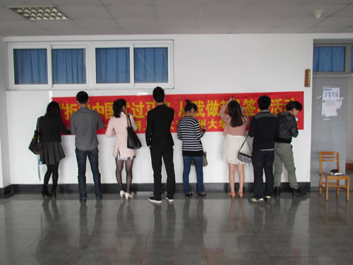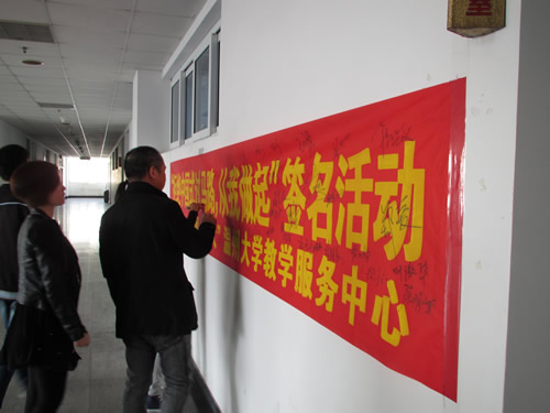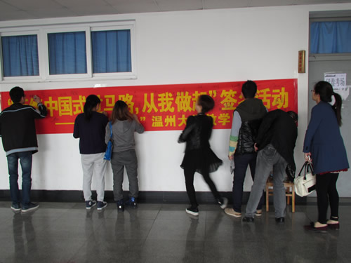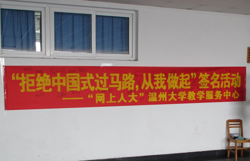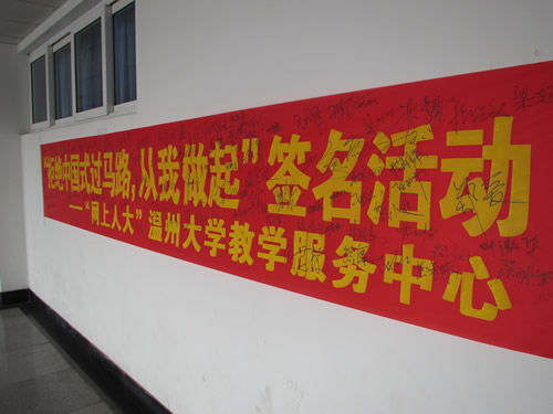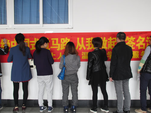 2013年4月13-14日,網(wǎng)上人大溫州教學(xué)服務(wù)中心針對城市行人違反交通規(guī)則亂穿馬路的不文明現(xiàn)象,舉行了“拒絕中國式過馬路,從我做起”的交通安全主題簽名活動?;顒诱稻W(wǎng)上人大201304批次課程考試,服務(wù)中心的老師在開卷考場的教室外懸掛了簽名橫幅,每當(dāng)考試前或者考試結(jié)束后,都有學(xué)生三個一群,兩個一伙兒地聚集在橫幅前簽下自己的保證。兩天下來,大約有一百多名學(xué)生積極參與。隨著考試的結(jié)束,這次別開生面的簽名活動也告一段落??粗蠹矣兄刃虻卣驹谑致房诘群蚪煌ㄐ盘枱簦?wù)中心的老師們都感覺十分欣慰。