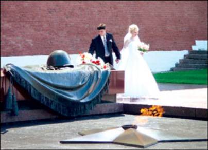 戰(zhàn)爭結(jié)束60年后,前往俄羅斯各地的二戰(zhàn)勝利紀念碑獻花,依舊是新婚夫婦們的傳統(tǒng)。