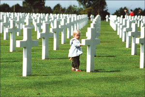 一名兒童在二戰(zhàn)犧牲美軍的奧馬哈墓地。忘記歷史就意味著背叛,而以怎樣方式來銘記歷史卻是一個問題。