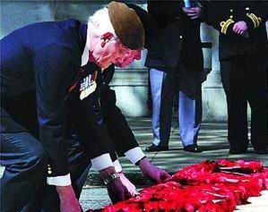 5月8日,在英國倫敦舉行的二戰(zhàn)歐洲戰(zhàn)場勝利60周年慶典上,老兵向陣亡將士紀念碑獻花