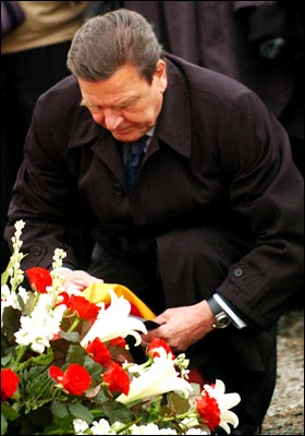 2005年4月10日,在德國東部城市魏瑪附近的布痕瓦爾德集中營舊址,德國總理施羅德為集中營遇難者紀(jì)念碑獻(xiàn)花