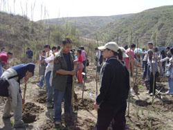 | 人大網(wǎng)院同學(xué)們和廷元希望小學(xué)的孩子們合影 | 熱火朝天的植樹場面 |