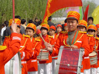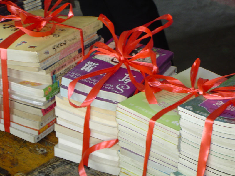 | 孩子們用歡快的鑼鼓聲迎接我們 | 給孩子們的書 | 師生代表在主席臺就坐 |