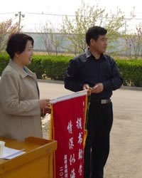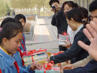 | 我們把圖書送到孩子們的手 | 同學(xué)們接受記者的采訪 | ????????? 學(xué)校領(lǐng)導(dǎo)給我們贈送錦旗,來表達對我們的謝意 |