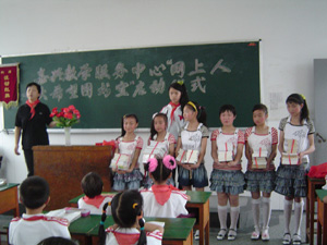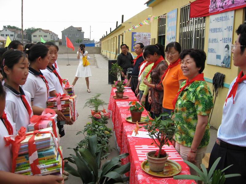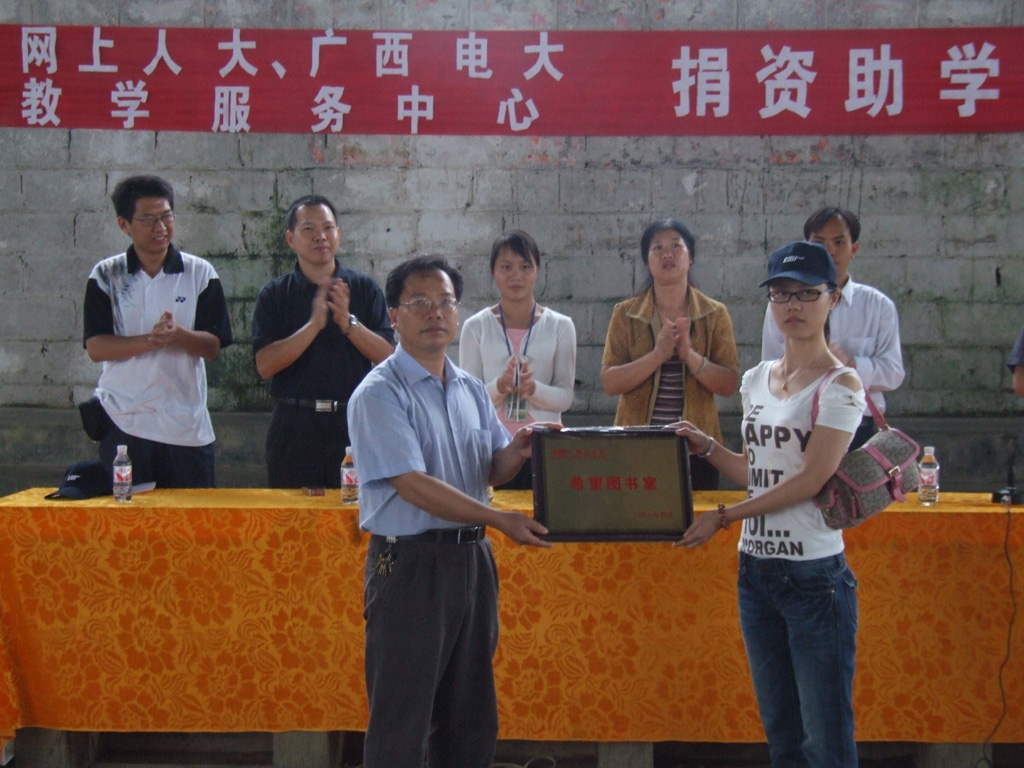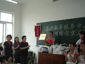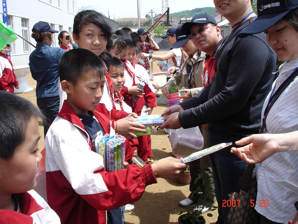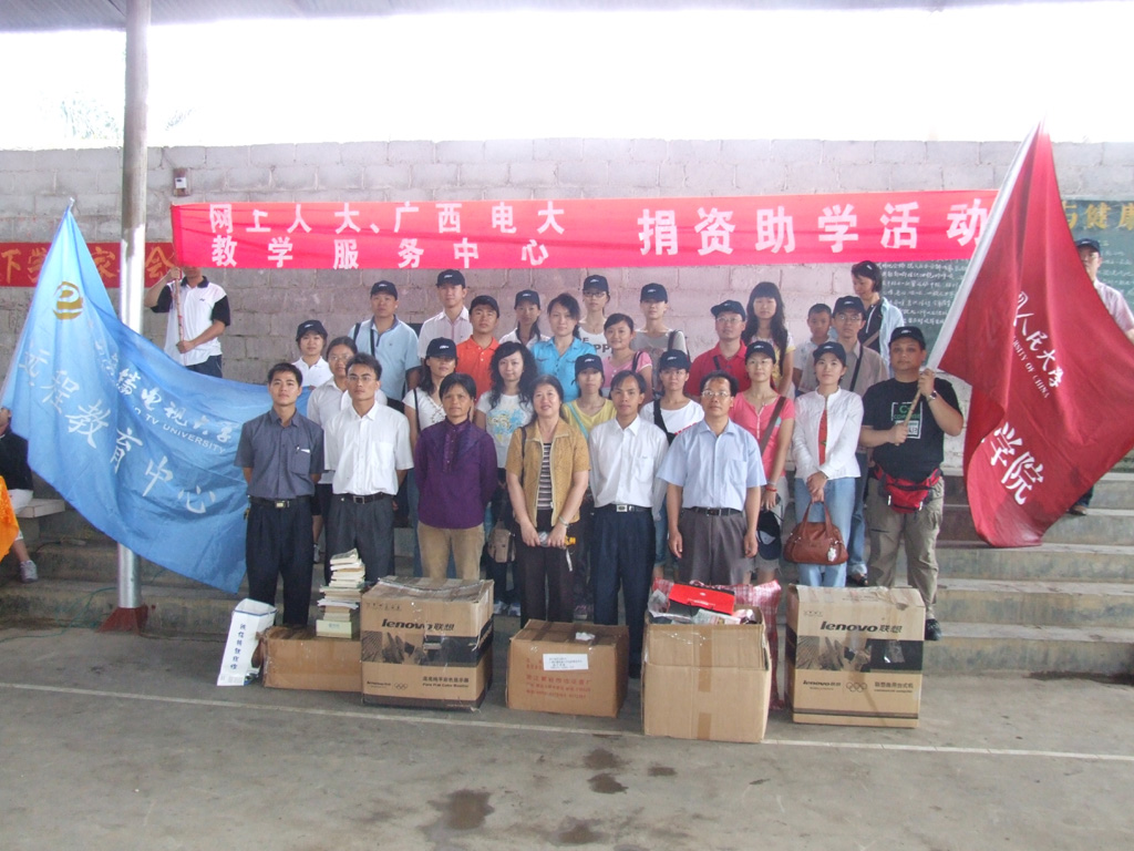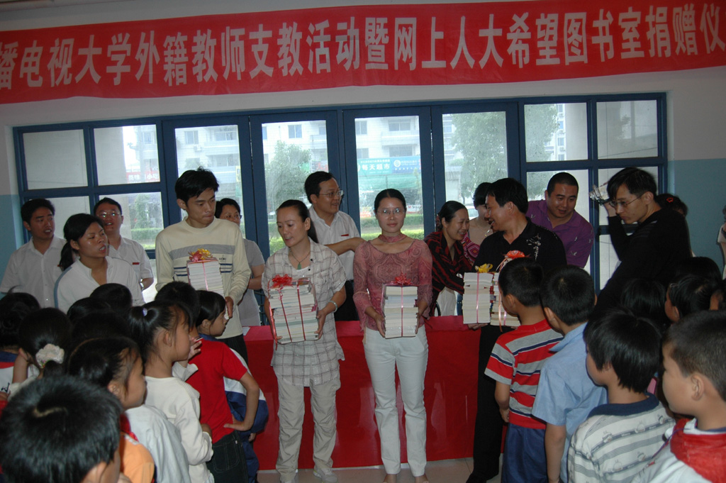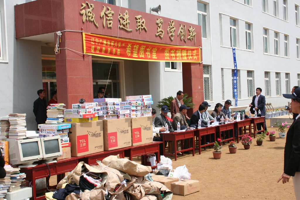 網(wǎng)上人大遼寧電大教學(xué)服務(wù)中心師生共計(jì) 318 人于 2007 年 5 月 20 日 ,以“關(guān)注我們身邊的教育貧困”為主題,舉辦了資助撫順市清源縣敖家堡鄉(xiāng)敖家堡小學(xué)貧困學(xué)生建立“希望圖書(shū)室”的活動(dòng)。在敖家堡鄉(xiāng)中心小學(xué)的操場(chǎng)上,服務(wù)中心的師生與敖家堡鄉(xiāng)中心小學(xué)師生們展開(kāi)了一場(chǎng)隆重的“希望圖書(shū)室”捐贈(zèng)活動(dòng)。捐贈(zèng)圖書(shū) 2187 冊(cè),價(jià)值 42685 元;捐贈(zèng)電視 3 臺(tái),價(jià)值 5000 元;捐贈(zèng)電腦 2 臺(tái),價(jià)值 4000 元,捐贈(zèng)衣物及文具若干。