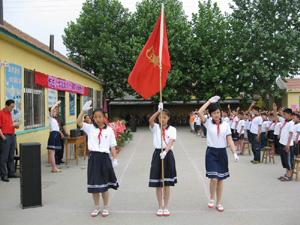 | 少先隊(duì)員們用莊嚴(yán)的出旗儀式迎接六一兒童節(jié)到來(lái) | 少先隊(duì)員們從人大網(wǎng)院師生手里接過(guò)嶄新的書(shū)籍 |