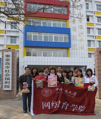 2009年4月25日上午9點,中國人民大學網(wǎng)絡教育學院秦皇島教學服務中心的10余名學生代表帶著精心準備好的兒童日用品和玩具,到市福利院為孩子們送去關(guān)懷和祝福。
