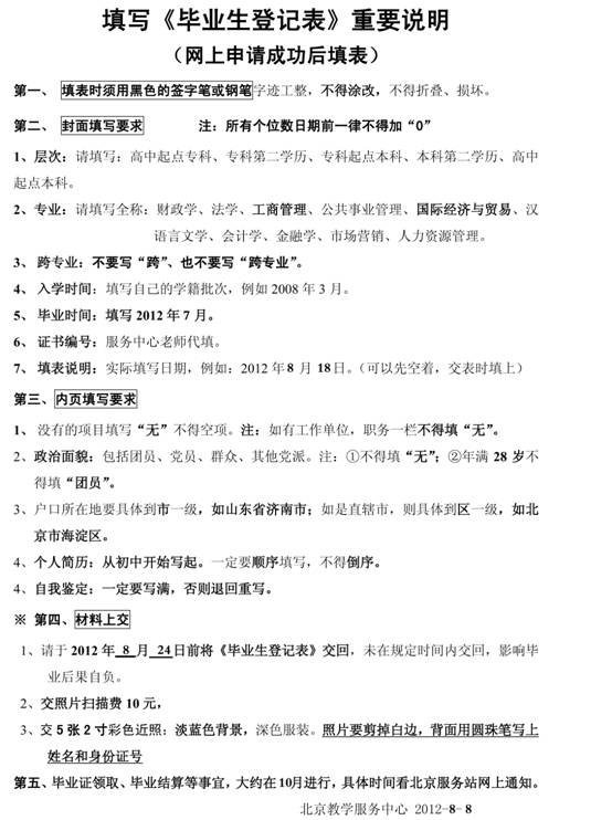 (1)《畢業(yè)生登記表》一式兩份,務(wù)必于2012年8月10日-2012年8月24日期間提交(上午9:00—12:00,下午13:00—17:00),周六、周日不休息