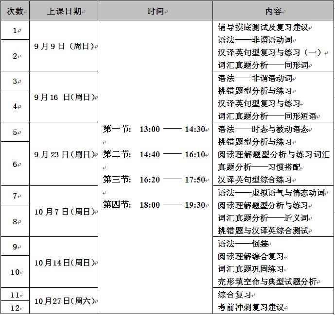 輔導時間:2012年9月9日開始,利用周六、日下午、晚上上課,十二次課,48課時。具體上課日期、時間見以下《課程表》。
