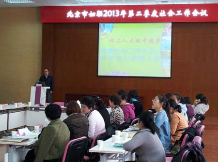 2013年4月12日上午,網(wǎng)上人大北京教學(xué)服務(wù)中心龔偉主任一行前往北京市婦聯(lián),借北京市婦聯(lián)社會(huì)工作會(huì)議之機(jī)向相關(guān)負(fù)責(zé)人員就市婦聯(lián)系統(tǒng)基層社工人才培養(yǎng)合作事宜進(jìn)行講解說明。北京市婦聯(lián)副主席趙麗君和北京市婦聯(lián)社會(huì)工作部部長陳延平和16區(qū)、縣負(fù)責(zé)同志出席。