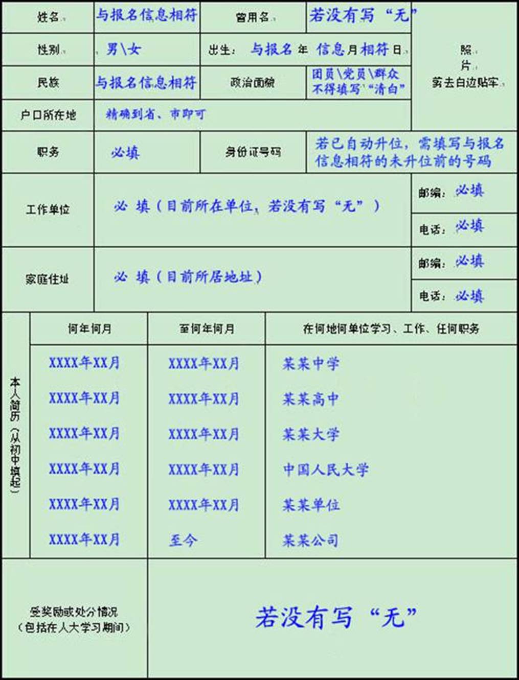 四、政治面貌一欄只能填寫黨員、群眾或團(tuán)員(年滿28周歲視為自動(dòng)退團(tuán)),不能填寫“清白”二字;