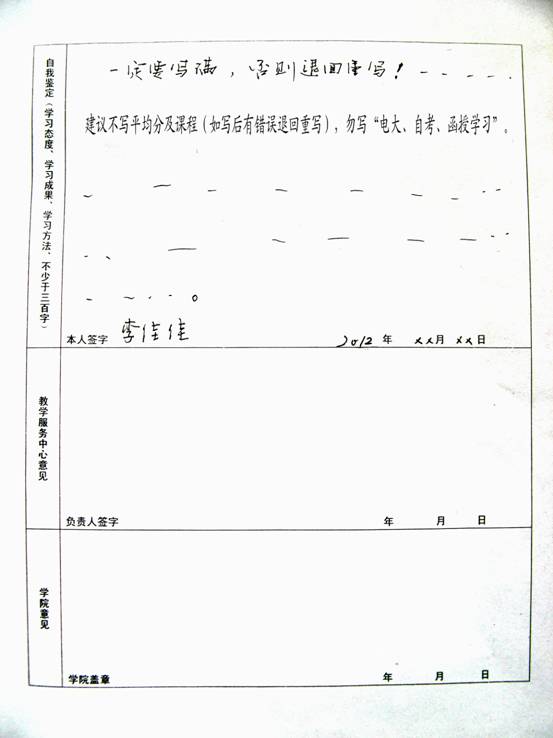 3、《畢業(yè)生登記表》內(nèi)要求寫(xiě)一份不少于300字的自我鑒定(學(xué)習(xí)態(tài)度、學(xué)習(xí)成果和學(xué)習(xí)方法等方面)及從初中開(kāi)始的學(xué)習(xí)和工作簡(jiǎn)歷,請(qǐng)事先準(zhǔn)備好。