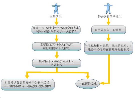 在籍學(xué)生需要在學(xué)院主頁自行預(yù)約考試,考試費(fèi)用將從教材費(fèi)中扣除;畢業(yè)后兩年內(nèi)的本科層次學(xué)生若除學(xué)位英語外,其它條件都符合申請學(xué)士學(xué)位的條件,可由所屬服務(wù)中心代為預(yù)約,考試費(fèi)用需要交到服務(wù)中心。